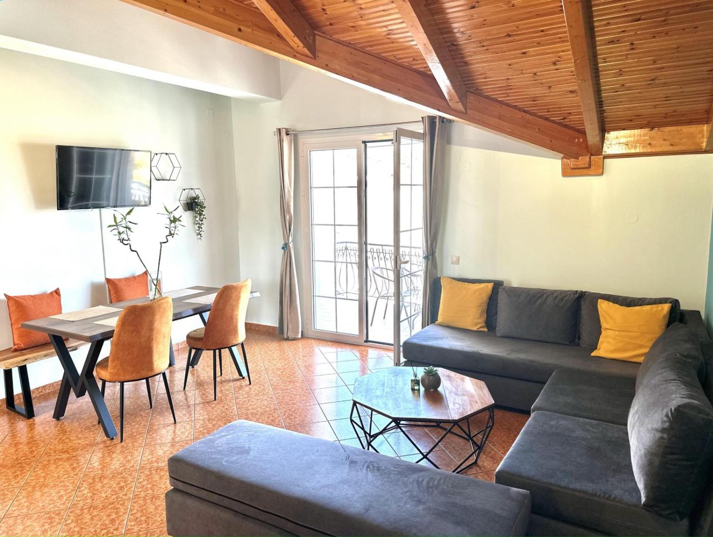 The spacious apartment is equipped with 2 bedrooms, 1 bathroom, bed linen, towels, a flat-screen TV, a dining area, a fully equipped kitchen, and a terrace with sea views. Guests can enjoy a meal on an outdoor dining area while overlooking the mountain views.