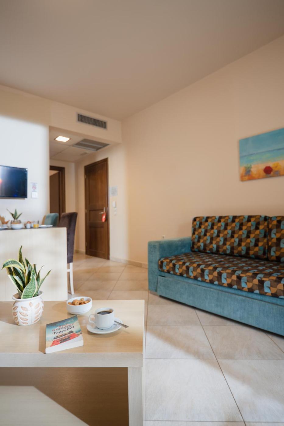 Suite with Side Sea View. Spacious unit with a bedroom and a separate seating room with sofa bed, suitable to accommodate a family of 2 adults and 2 children. It is fitted with anatomic mattresses, air conditioning and also includes a satellite TV and mini frigde. Daily cleaning service is provided. Side sea views are featured. ;
