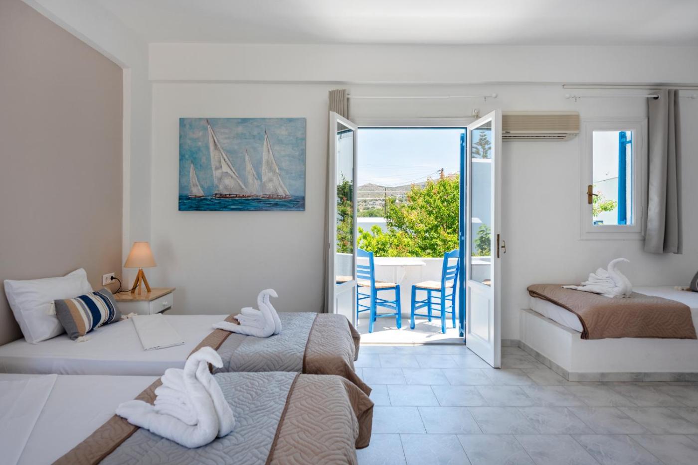 Following the typical style of Paros Island, Ayeri Hotel rooms are simply furnished and have a private balcony or patio. They are air conditioned and equipped with an LCD TV, electric kettle and mini fridge. The private bathroom features a shower and a hairdryer.