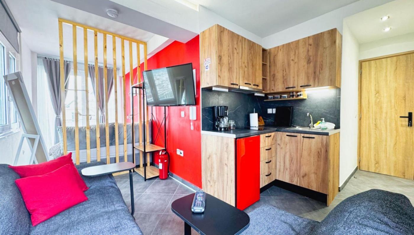 Studio Apartment. Featuring a private entrance, this air-conditioned apartment is comprised of 1 living room, 1 separate bedroom and 1 bathroom with a shower and a hairdryer. The well-fitted kitchen has a stovetop, a refrigerator, kitchenware and a tea and coffee maker. This apartment features soundproof walls, flat-screen TV, sea views, as well as winechampagne for guests. The unit offers 2 beds.